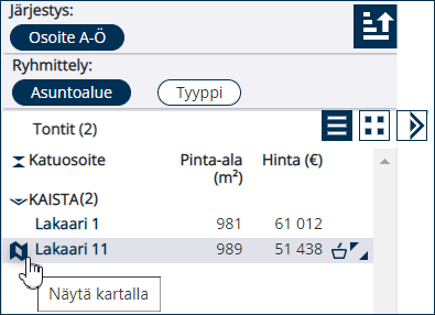 Ryhmittele tontit asuntoalueen tai tonttityypin mukaan. Tonttien selailussa voi kaikki ryhmittelyt avata tai sulkea kerralla. |